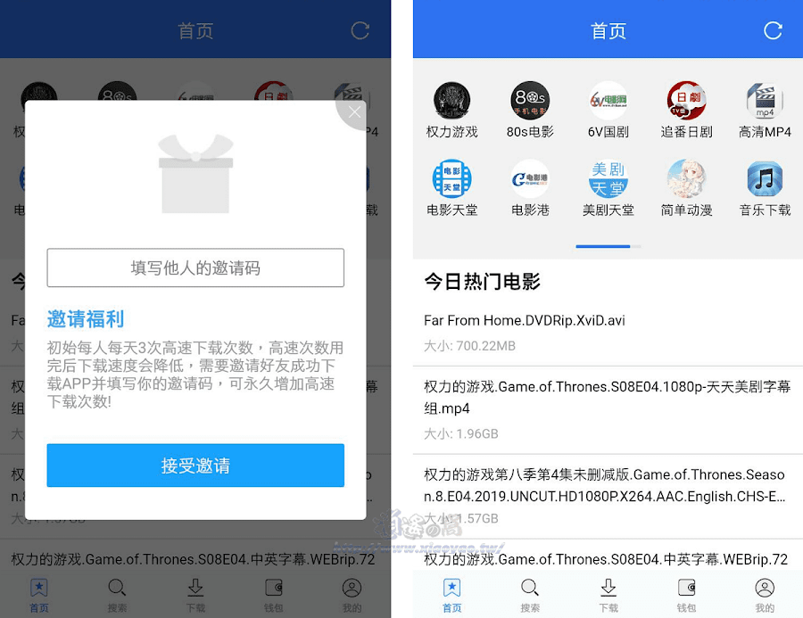 首次使用會出現「填寫邀請碼」,這款 APP 採用邀請制度來提高每日高速下載次數。進入主畫面會看到多個大陸線上影視網站,有電影天堂、80s電影、高清MP4等。