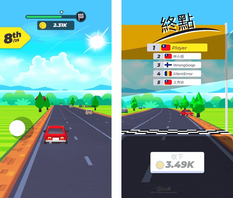 其實完全不控制也能跑完全程,速度不會減慢也不用擔心跑出賽道,到達終點會有排名也能領取金幣。