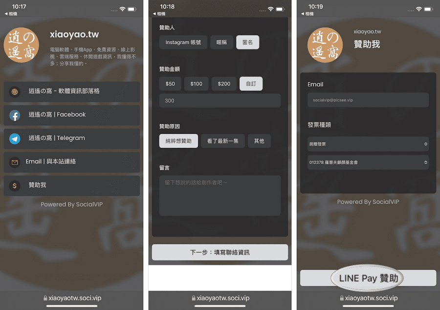 10. 全部設置完成,複製面板連結並放置 Instagram、YouTube 或任何要顯示的地方,他人點擊 SocialVIP 連結就能導向其他社群平台,也能透過 LINE Pay 小額贊助。
